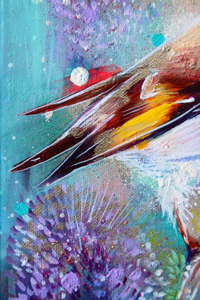 Using acrylic and spray paint, Sian brings the goldfinch gently into view, emerging from layers of Prussian blue, teal, and turquoise. Gold spray catches the light with a subtle shimmer, while soft white tones evoke the stillness of early morning.
