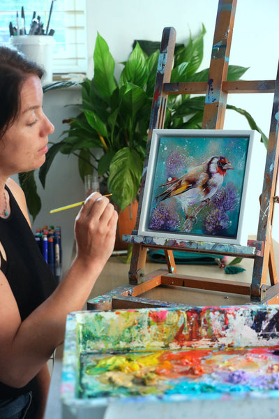 Layer by layer, Sian builds depth and atmosphere, combining delicate brushwork with soft, diffused spray paint. The result is an ethereal finish where edges blur, colours breathe, and the goldfinch feels almost alive within its surroundings.