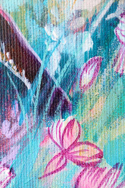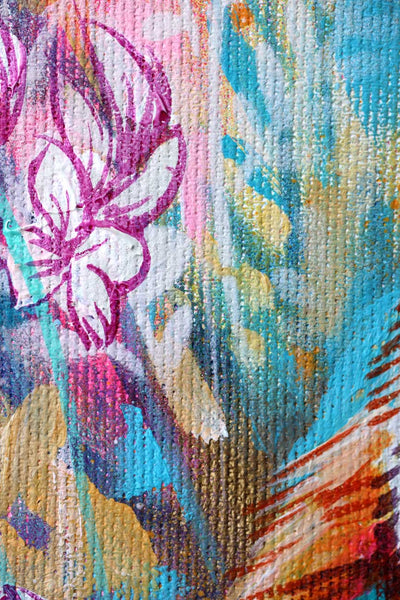 Sian used acrylic and spray paint to create this vibrant painting. The dreamy colours of vivid orange and dusty pink pop against a lush background of seafoam and turquoise. Flashes of gold spray paint catch the light with a shimmering effect.