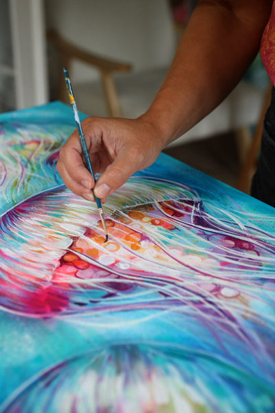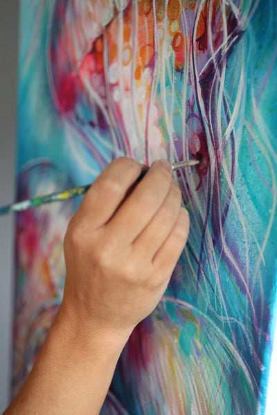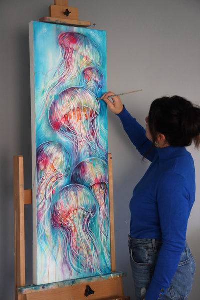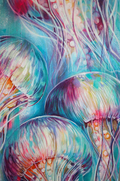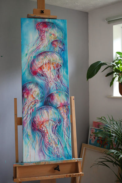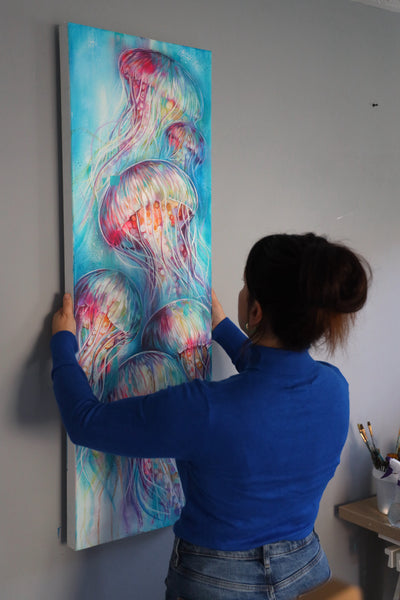This luminous original painting captures the quiet magic of jellyfish drifting through tropical waters—those moments that linger from coastal holidays, salt-tinged air, and long, unhurried days by the ocean. Whether your home already carries a coastal theme or you simply feel drawn to the mystery of the deep, Ocean Bloom brings that sense of escape straight onto your wall.
