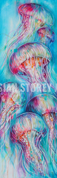A one-of-a-kind artwork by British artist Sian Storey, this painting is for ocean lovers, dreamers, and anyone who feels at peace near the water. Its elongated canvas and glowing palette evoke the gentle rise and fall of the tide, while the jellyfish seem to float effortlessly, suspended in time. Every glance offers a small moment of calm—like looking out to sea and forgetting the rest of the world for a while.