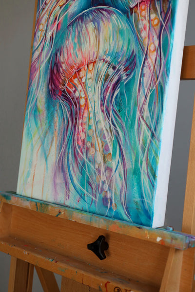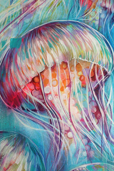 Dive into the luminous world of 'Ocean Bloom' - an enchanting painting that brings the otherworldly beauty of jellyfish to life.