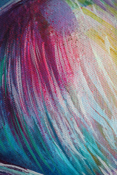 Hand-painted in Sian’s studio using acrylic and spray paint, the canvas shimmers with layered hues of teal, turquoise, violet, and flashes of gold. The gold catches the light beautifully, echoing sunlight dancing across the surface of the ocean. Soft, diffused edges give the piece an ethereal, dreamlike quality, as if you’re peering into deep, tranquil waters.