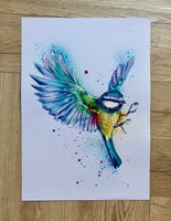 - An original painted drawing of a flying blue tit hand drawn and signed by artist Sian Storey.