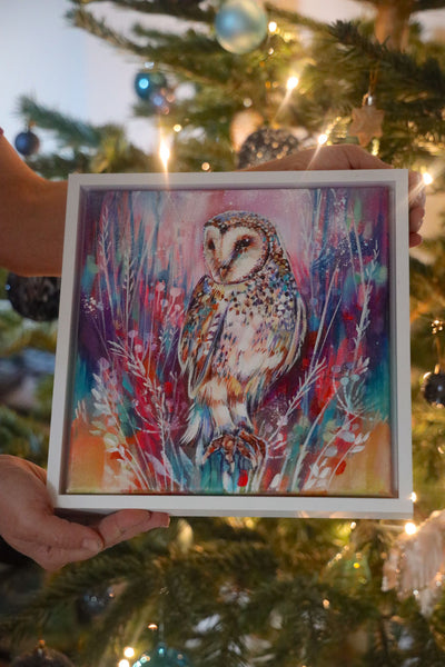 'Winter Light' captures the serenity of a winter dusk, and a wild dusk chorus. This majestic barn owl is set peacefully against the ethereal dusty turquoise and deep violets of the last light of the day. The rich and vivid colours come together to evoke a tranquil and serene atmosphere.
