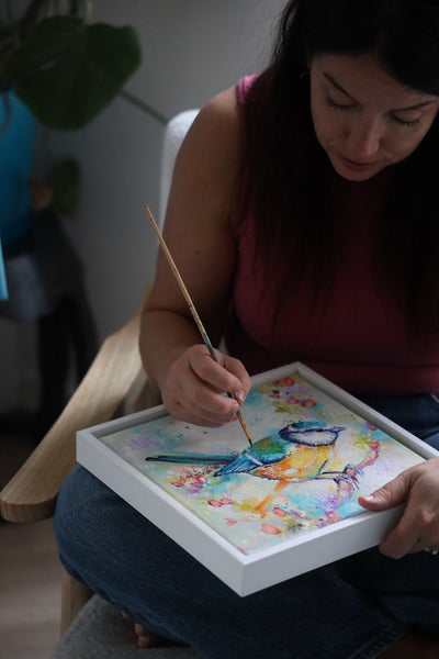 Morning Dew is a delicate painting of a blue tit, capturing a fleeting moment of calm as the day begins. Soft pastel blush tones sit alongside green gold, Indian yellow, and sky blue, creating a gentle, uplifting colour palette that feels fresh, airy, and full of light.