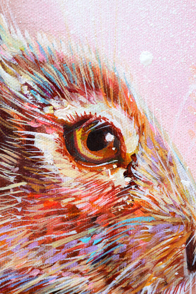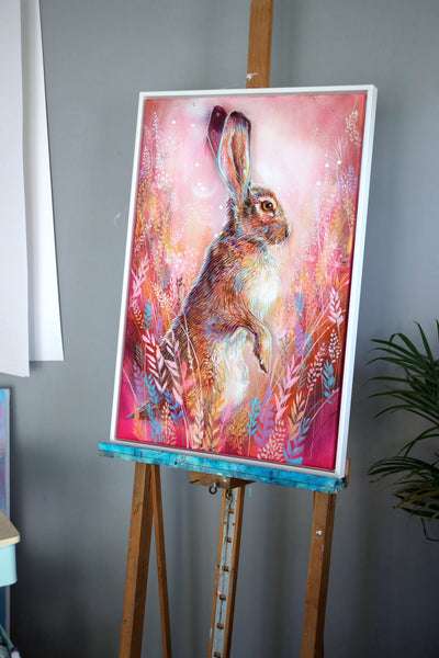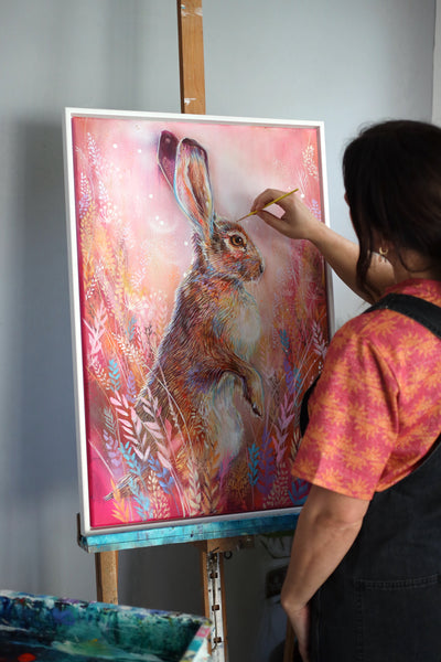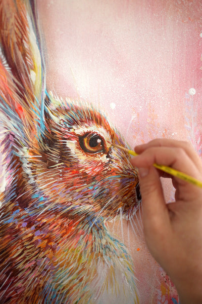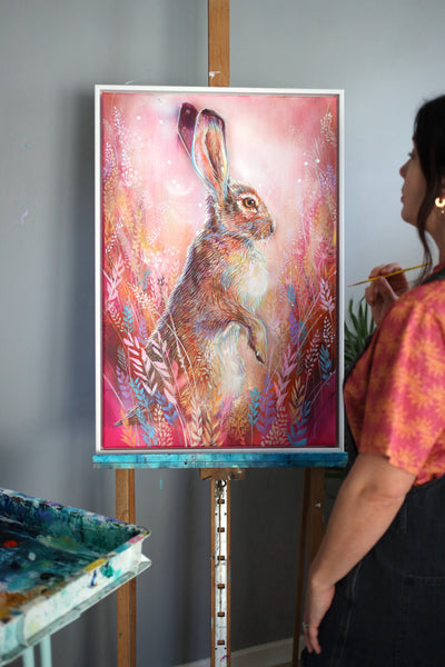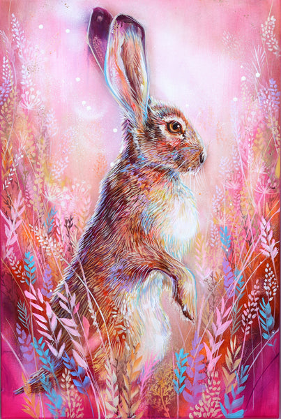 Experience the vibrant energy of 'Spring Blush', an atmospheric hare painting infused with joyful seasonal colour and luminous metallic accents. Inspired by the warmth and renewal of spring, this artwork celebrates light, vitality and the symbolic spirit of the hare.