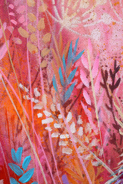 The colour palette reflects the joy of spring in full bloom. Hot pink and pastel pink echo the brightness of fresh blossoms, while orange and glowing yellows — including soft Naples yellow — bring warmth and sunlight into the composition. Gentle touches of lilac soften the palette, while metallic gold highlights shimmer subtly across the surface, catching the light and adding a sense of radiance.