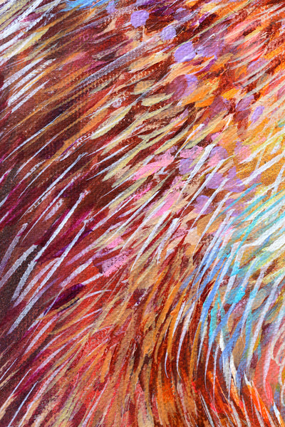 Created with layered acrylic, spray paint and metallic detailing, the painting balances fine detail with expressive texture. Colours move and blend across the canvas, creating energy and light, while the hare remains calm and grounded at the centre of the piece.